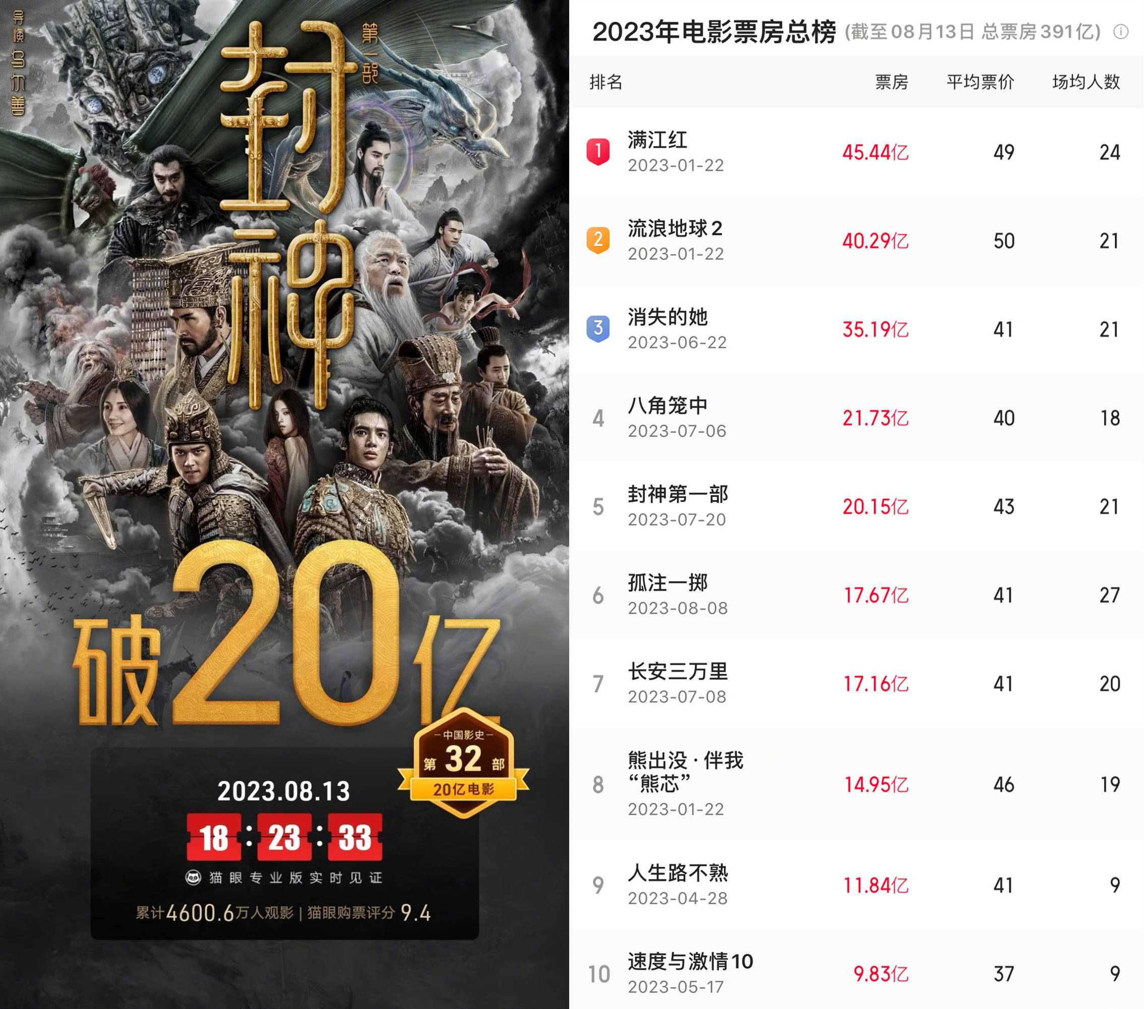 搜狐娱乐讯 据猫眼专业版数据,截至8月13日18:23,乌尔善执导,费翔、黄渤、于适、陈牧驰、娜然等主演的电影《封神第一部》上映第25天 ,累计票房突破20亿,累计观影人次4600.6万,居2023年度内地电影票房榜第五位,也成为中国影史第32部破20亿电影。
