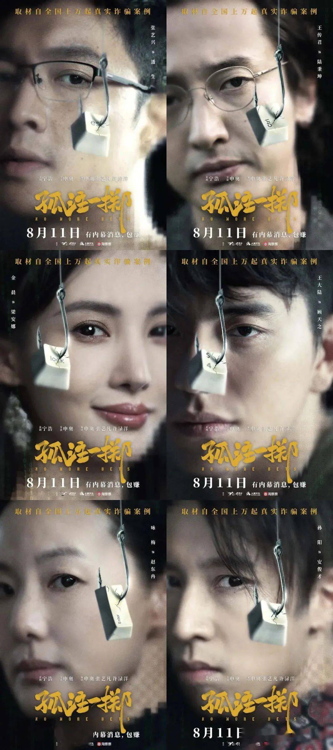 角色海报暗藏每个人物的命运和故事,人物面前分别放着不同鱼钩钓着的按键,代表不同意思。张艺兴的esc代表被解救或逃离;王传君的ctrl代表控制者;金晨的lock代表被困住;王大陆的4或“$”代表fall into money或是隐喻死亡的意思;咏梅的enter代表进入调查;孙阳的x代表未知和神秘。