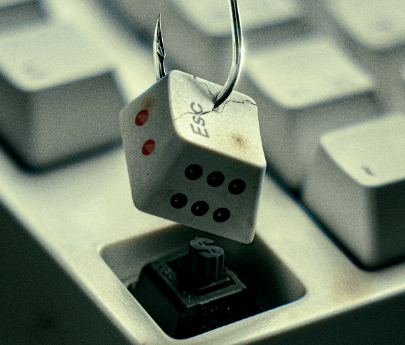 在《孤注一掷》海报上面,鱼钩钓着Esc键盘的一角,侧面印着骰子上的两点和六点,键帽下的黑色键是美元符号$,键盘旁隐隐散落着几滴斑驳的血渍,说明网络赌博只是幌子,背后是电信诈骗和非人虐待。
