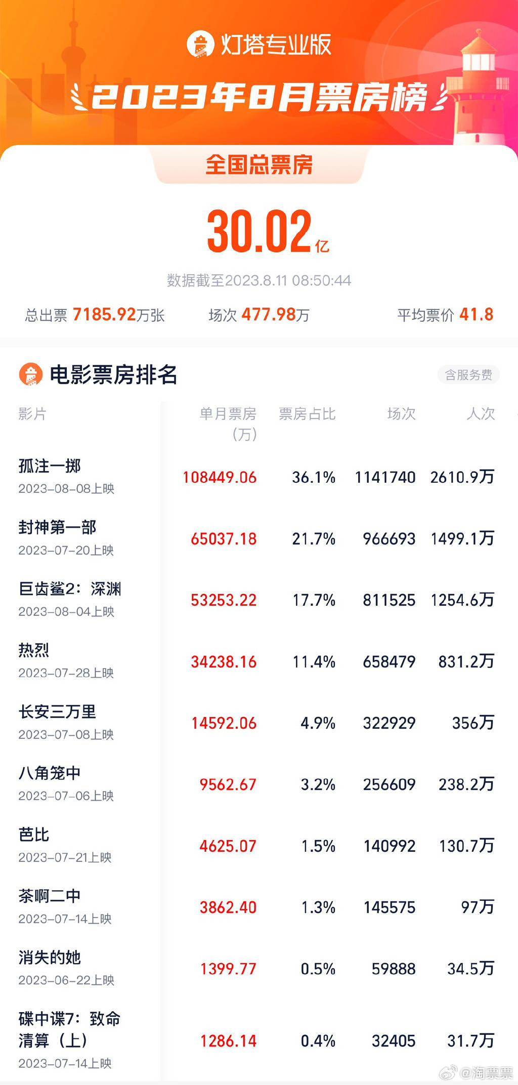 原标题:2023年8月票房破30亿 《孤注一掷》《封神》前二