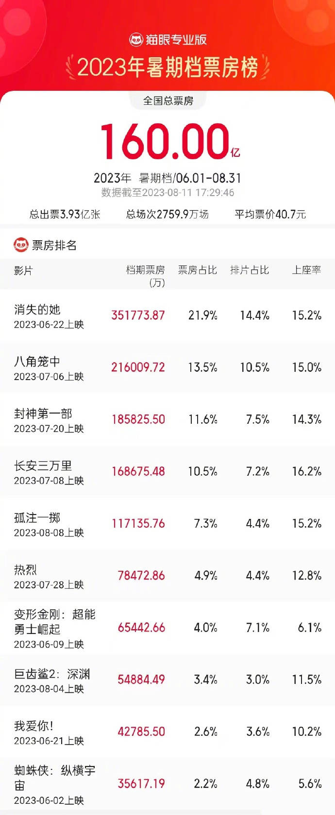 原标题:2023年暑期档总票房破160亿 《消失的她》《八角笼中》《封神第一部》分列前三