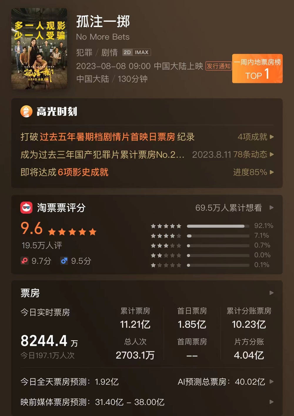 昨日单日票房接近1亿,目前累计票房超过11亿,《孤注一掷》毫无疑问成为了2023年暑假最后一部爆款热门影片。