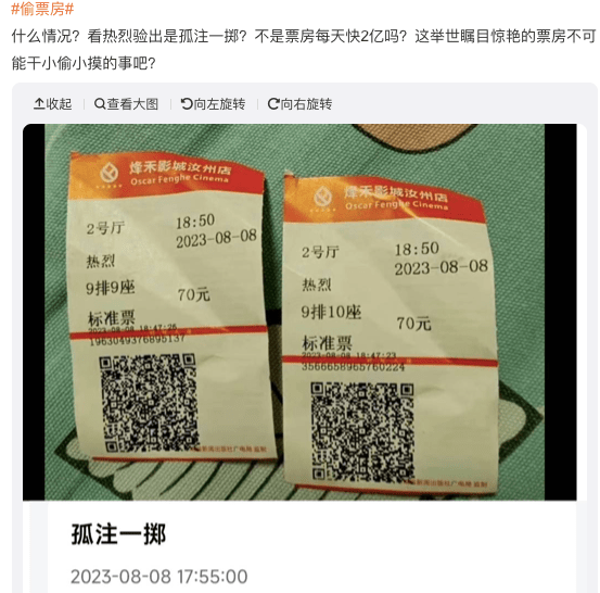 直到8月10日有网友表示看《热烈》但验出是《孤注一掷》的票。这把火就烧到了它头上。当然目前为止,大家关于偷票房的这件事态度一致,且未有更确切的证据指向某部影片,目前网友们的指责都还真是存在于个别现象之中。