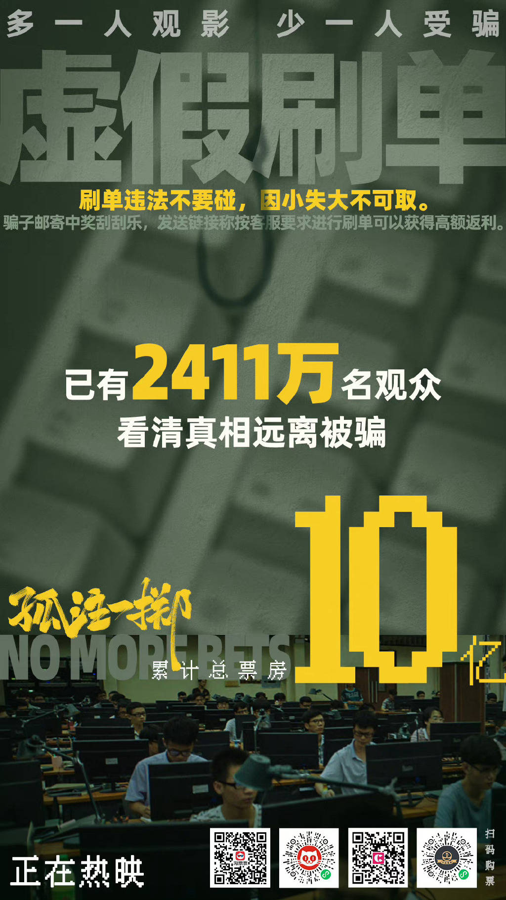 最后,就现实意义的角度,《孤注一掷》作为大型反诈宣传片,它的社会现实教育功能性的确如影片海报宣发的“多一人观影,少一人受骗”。