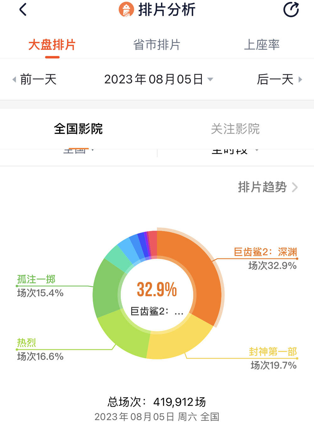 一个容易被忽视的细节——《孤注一掷》点映当天票房达到1.84亿的背后,是点映的超高排片率。影片于8月5日起开启全国超前点映,根据灯塔数据,首日排片占比超过15%,大规模点映堪比提前上映,这个数据甚至超过了彼时正在热映的《热烈》。