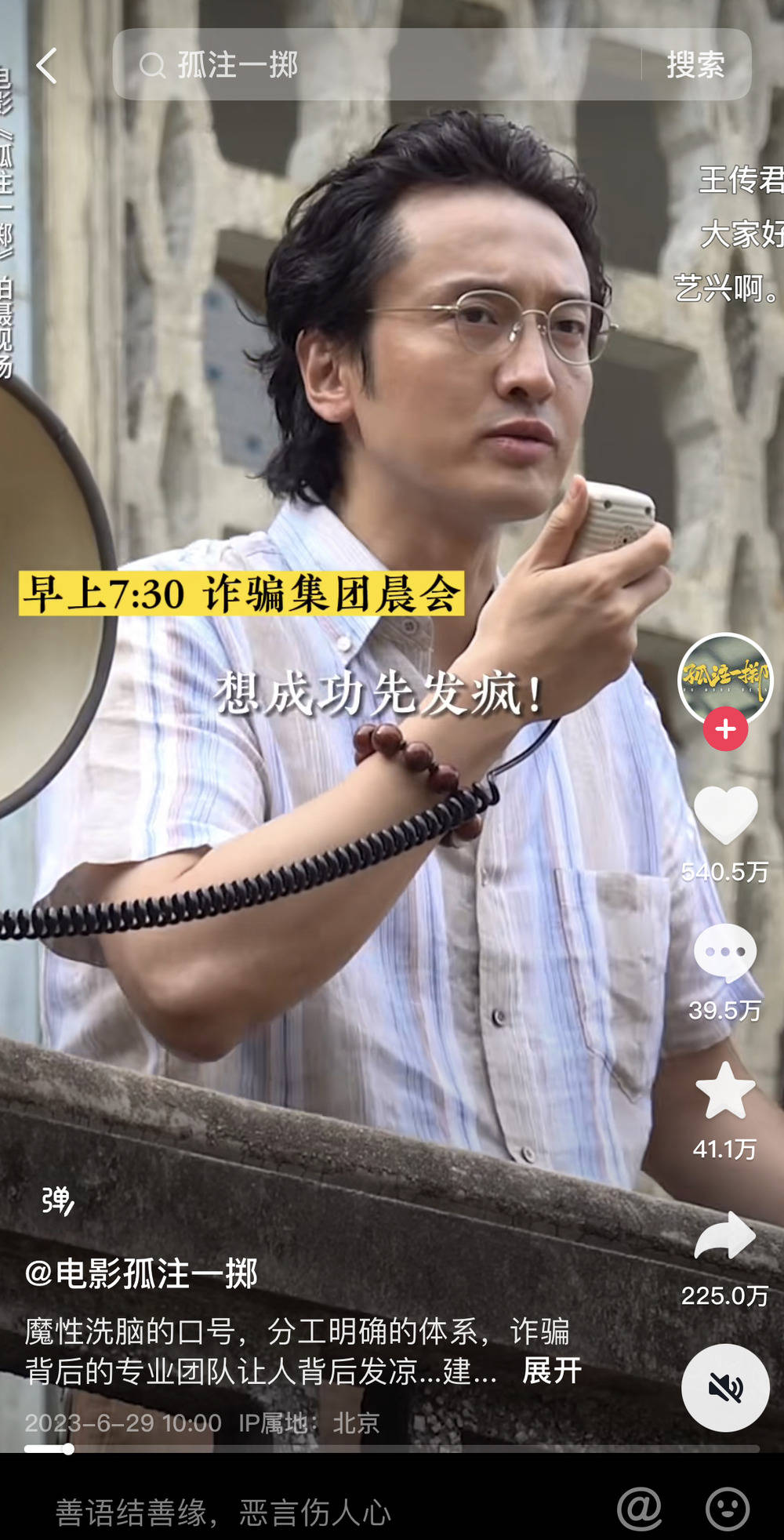 《孤注一掷》在抖音的官方账号点赞量超过1.1亿,合计发布作品161条,其中播放量过百万是王传君扮演的陆经理在诈骗集团的晨会上喊话的片段。
