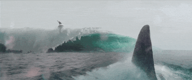 泰勒手提鱼叉与三条巨齿鲨搏斗的镜头,是电影最炸裂的部分。人与鲨鱼在海面上周旋,巨齿鲨张开血盆大口,露出一口阴森森的白牙,每次咬合都能把观众吓一大跳,虽然夸张,却气场拉满,带来十分震撼的视觉效果。