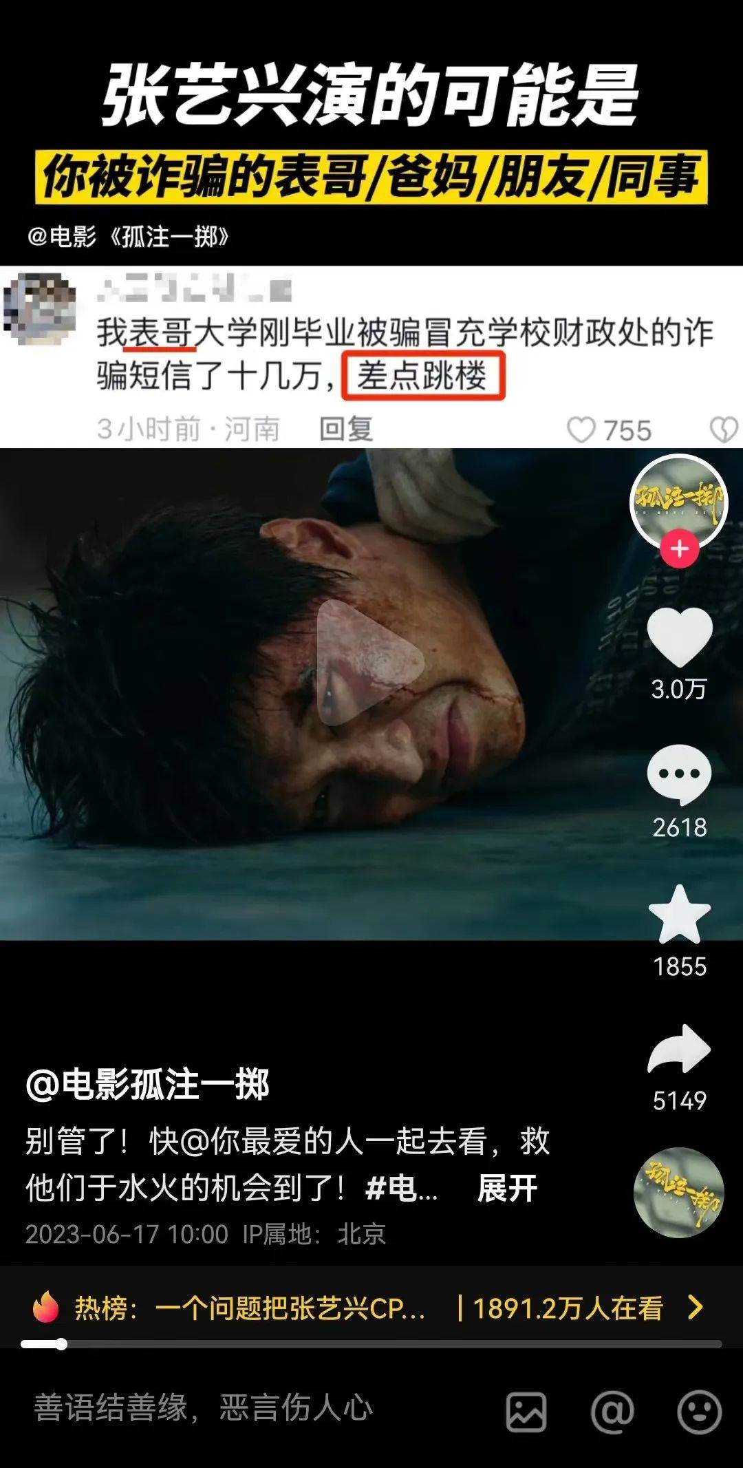 宣传时,片方也结合以上剧情和人设,打出“张艺兴演的可能是你被诈骗的表哥/爸妈/朋友/同事”等现实关联度极高的推广语,并收获了强劲的破圈传播效果。