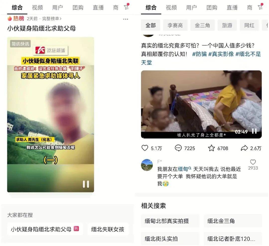 但也是因为如此,反而撞上了近几个月短视频平台疯狂传播的“缅北诈骗真实画面”、“缅北电诈园区”等热点话题。