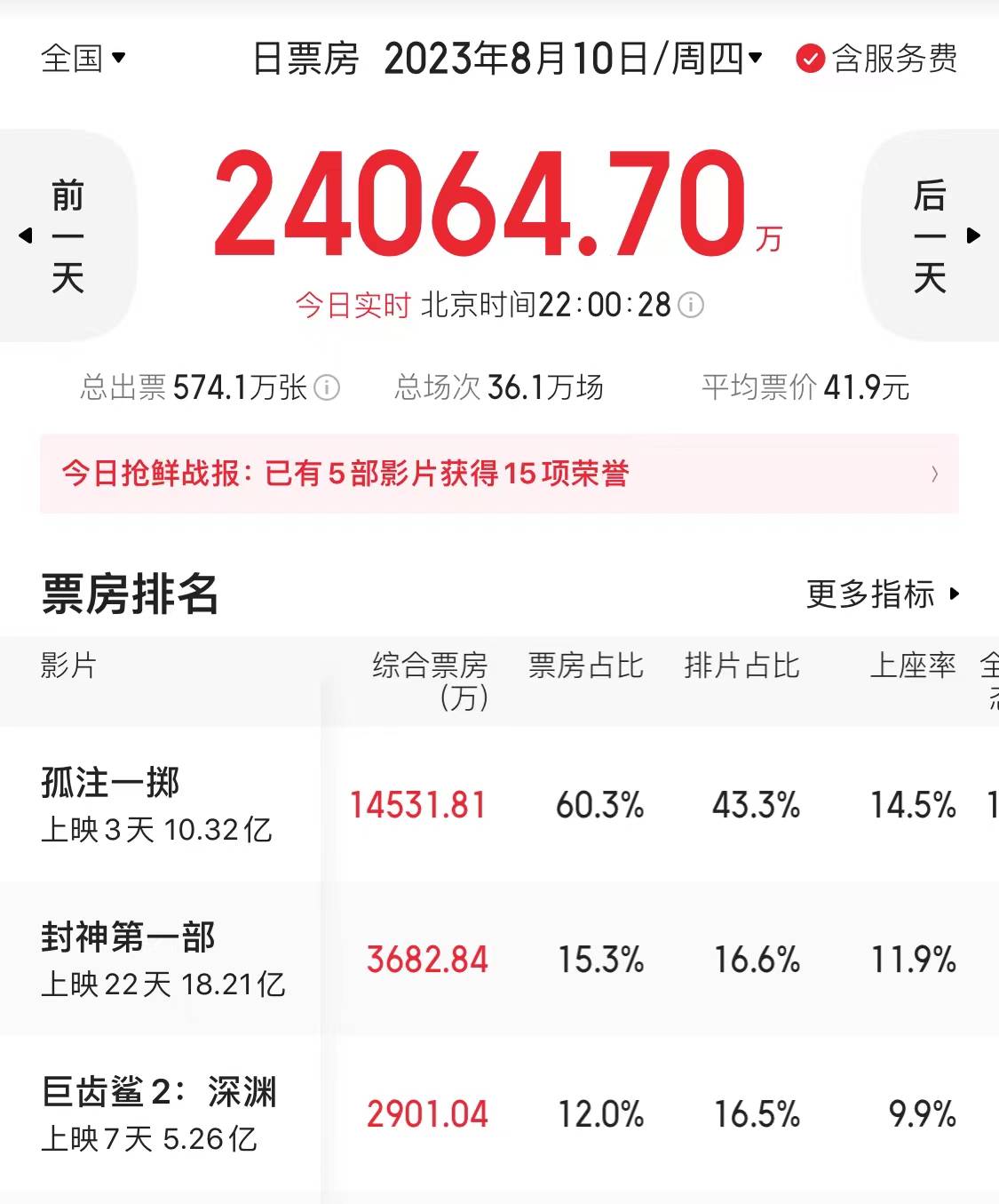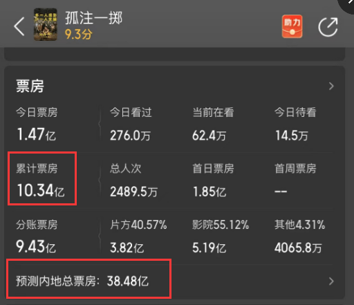 正式上映第一天,排片率高达41.8%,影院愿意多加场,观众也足够捧场,首日破7亿,第二日票房近9亿,第三日顺利突破10亿。猫眼专业版预测的总票房,也从一开始的12亿飙升到38亿 。