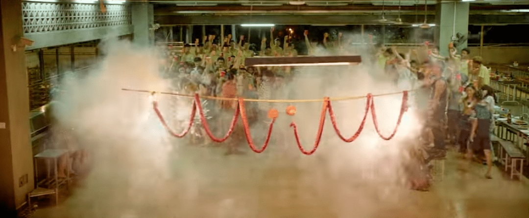 导演运用蒙太奇交错剪辑,一边展示阿天家人和女友遭遇的巨大痛苦和崩溃,一边展示诈骗工厂燃放烟花爆竹,为“巨额业绩”集体庆功的欢腾热闹……悲喜境遇对比之强烈,既触目惊心又叫人唏嘘。