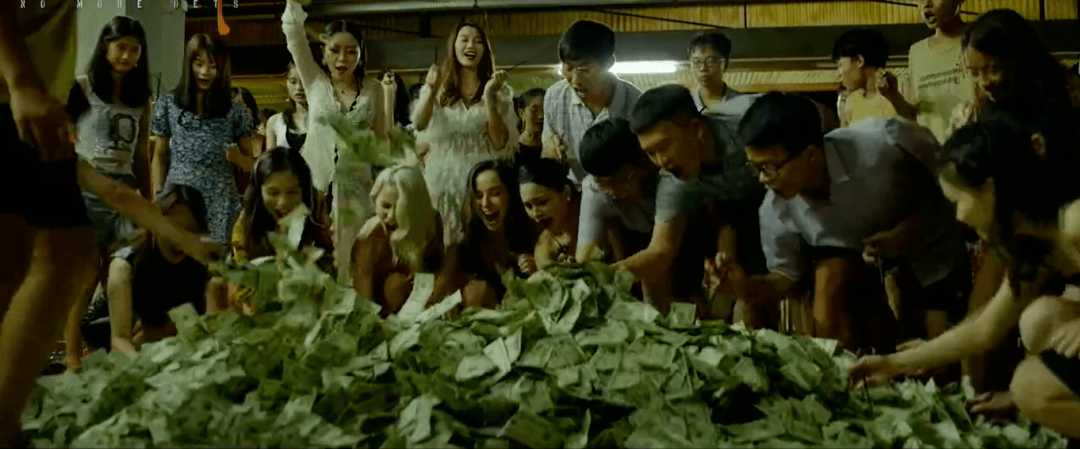 通过阿天被诈骗巨额钱财的实时犯罪情节,影片又顺势进入了下一段犯罪产业链的奇观展现——诈骗工厂庞大高效的销赃、提现流程,以及“无法无天”、难以根除的犯罪土壤。