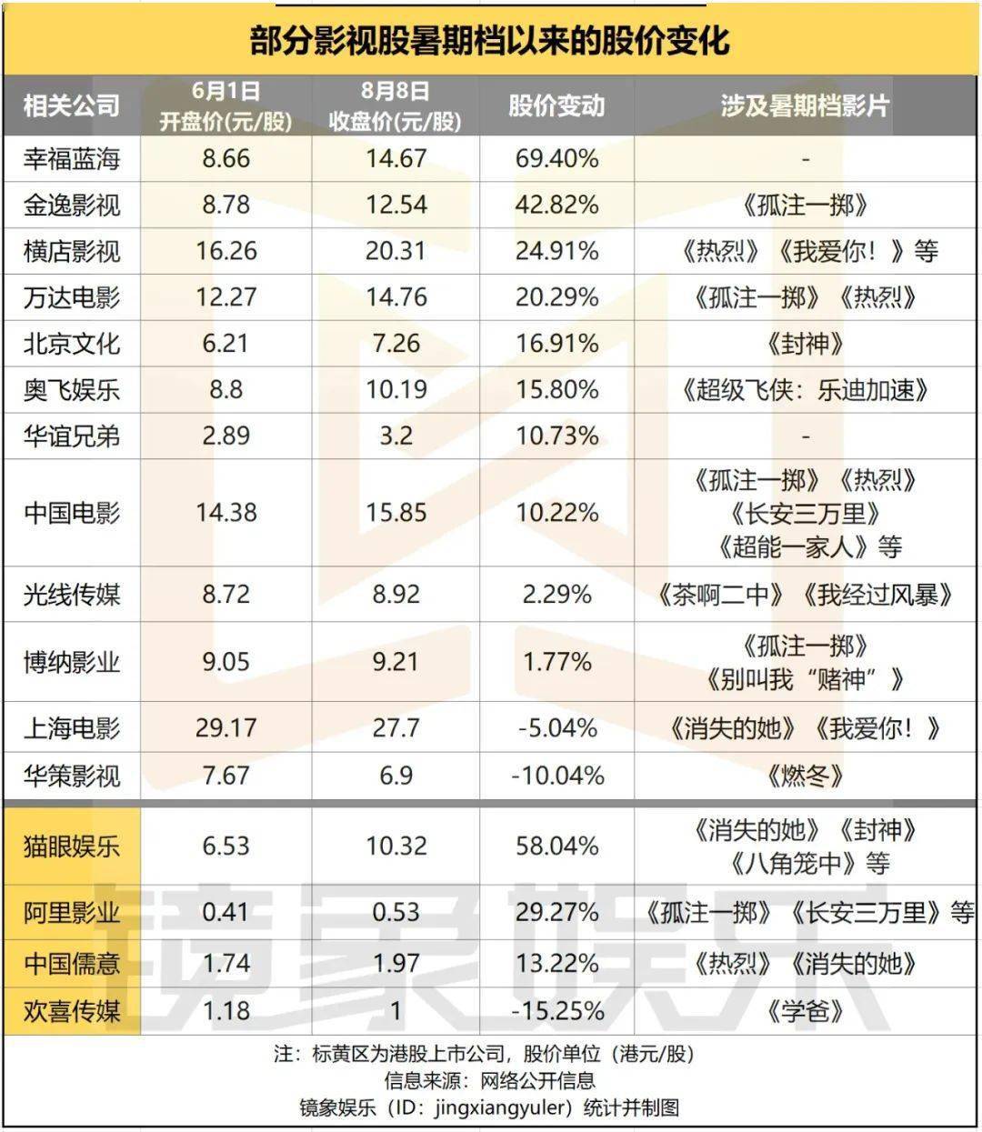 此外,股价变动较大的还有票务及互联网宣发平台背后的上市企业。截至8月8日,港股上市公司猫眼娱乐股价累计上涨超58%,淘票票背后的阿里影业也出现近30%的涨幅。