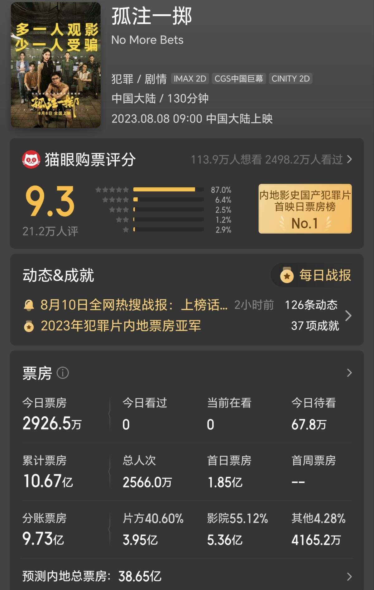 搜狐娱乐讯 (哈麦/文)《孤注一掷》超强势头不减,点映三天收票房5.37亿元,提档正式上映后,排片大增,三天日票房分别为1.85亿元、1.64亿元、1.53亿元,6天累计票房突破了10亿元,达到10.4亿元。