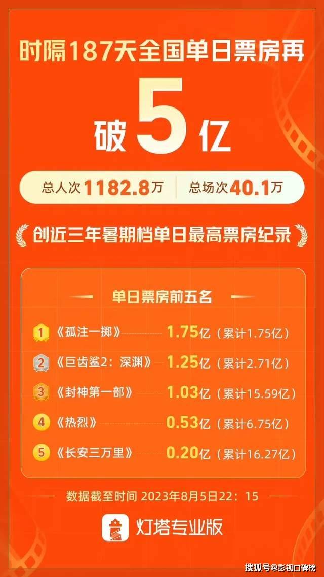 8月6日当天收官,内地电影市场票房时隔了整整187天,再次突破5亿大关,并且创下近三年暑期档单日票房纪录。《孤注一掷》、《巨齿鲨2》、《封神第一部》位列当日票房前三位,单日票房均破亿。