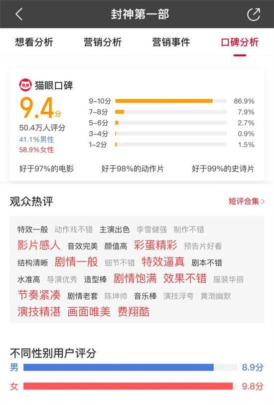 不仅如此,《封神》虽然类型为魔幻史诗动作大片,却“意外”俘获了女性观众的“芳心”。某购票平台显示,《封神》的想看用户画像52.8%为女性,且女性评分高达9.8分,远高于男性的8.9分。