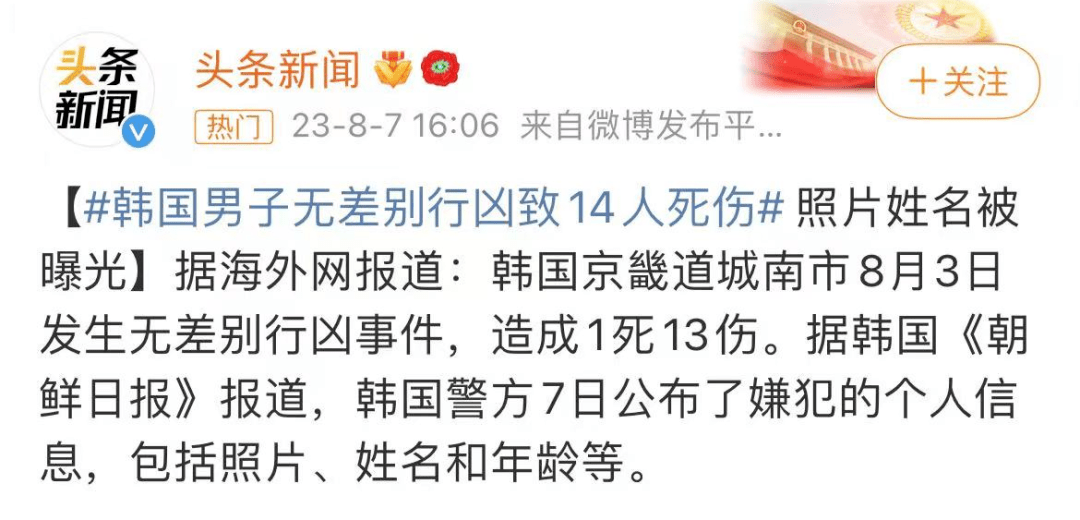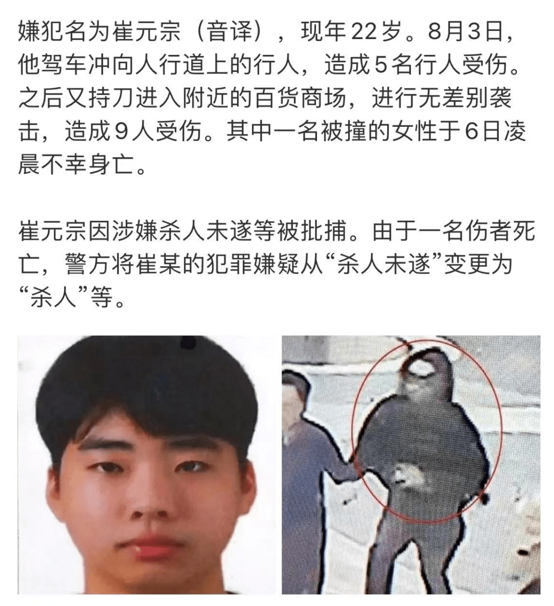 再到8月3日,韩国京畿道城南市,崔某在商场进行差别杀人,造成14人死伤。