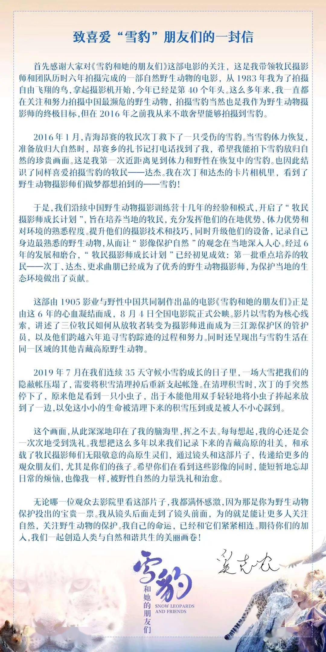 正如导演在《致喜爱“雪豹”朋友们的一封信》中所写,每一位观众,都是在为野生动物保护投出自己宝贵的一票,而百花齐放的影市中,这部创造人与自然和谐共生美丽画卷的作品,值得拥有它的一席之地。