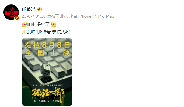 8月7日,张艺兴发微博,确定《孤注一掷》从8月11日提档到8月8日,更是令人震惊!