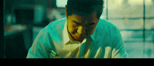 张艺谋用多个镜头来表现他隐忍的一面。