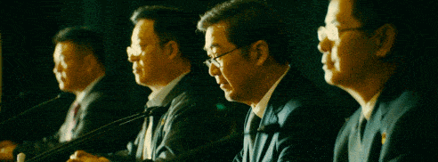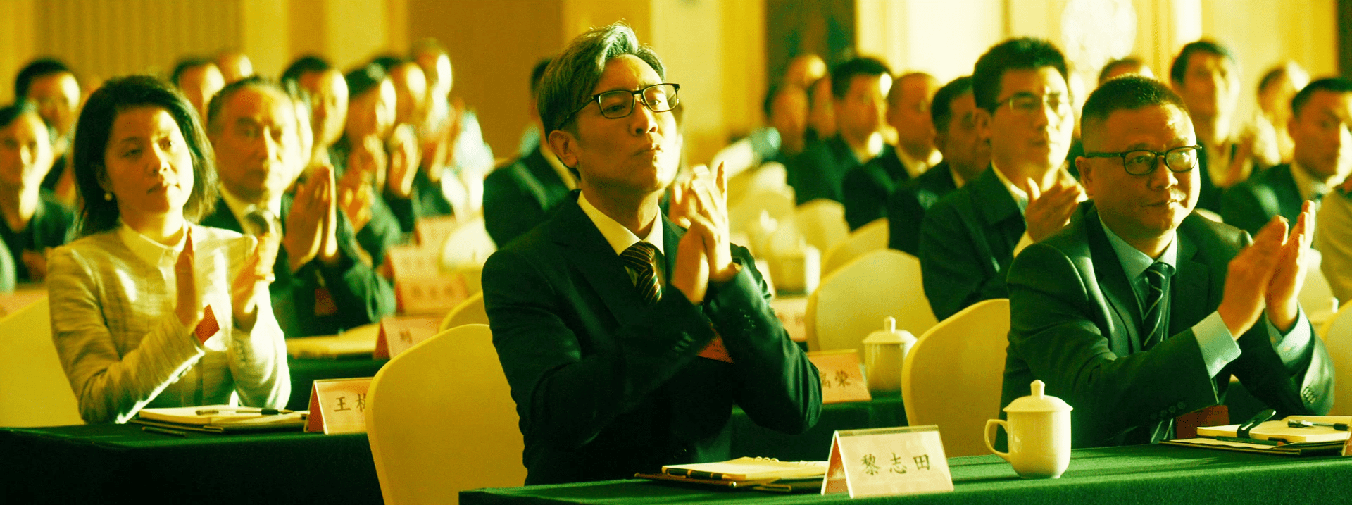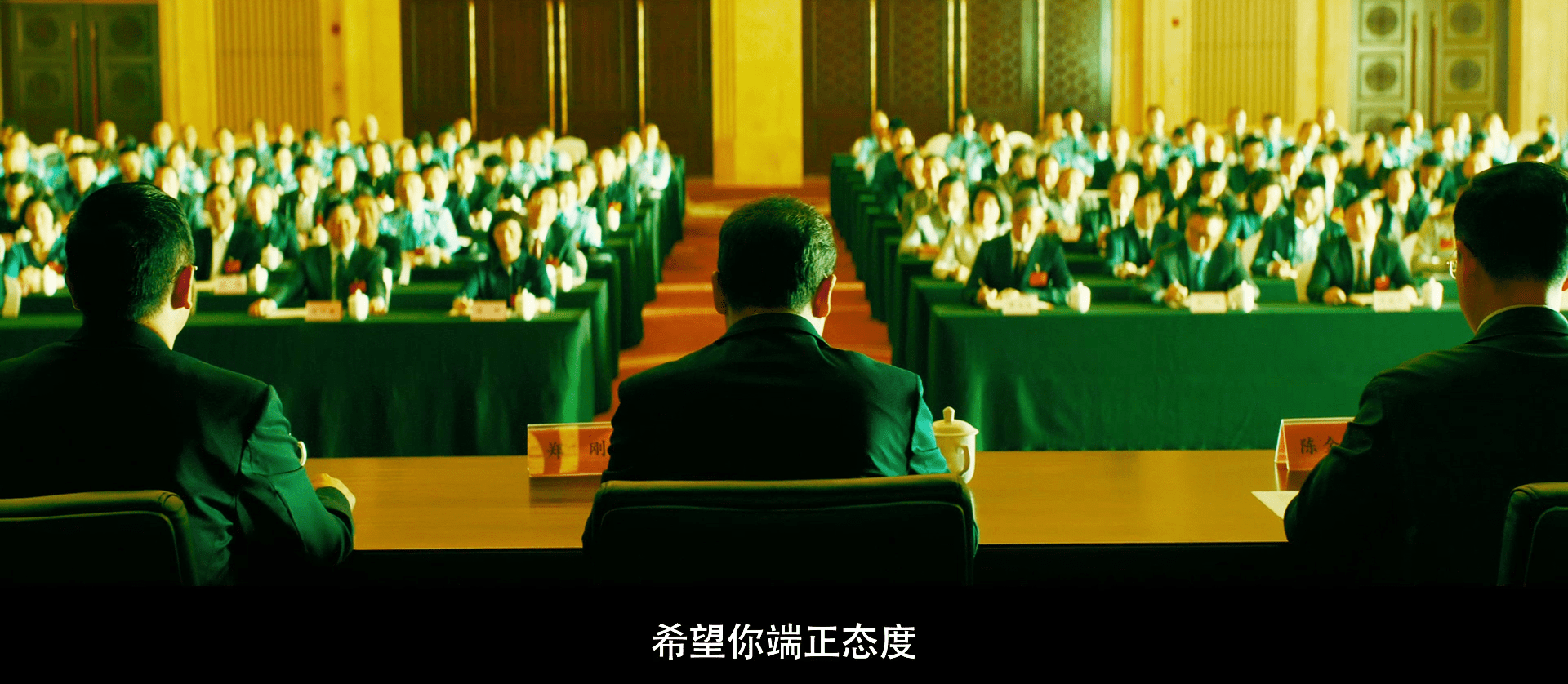 预告中,他戴副眼镜,端坐在会议大厅主席台中央。