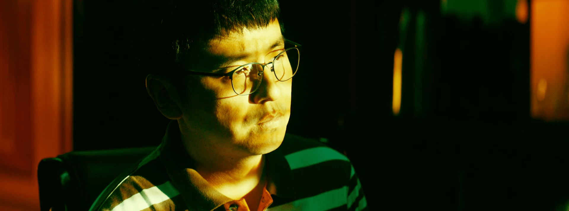 他在房间内独思,光影投射在他脸上,也是黄色的。