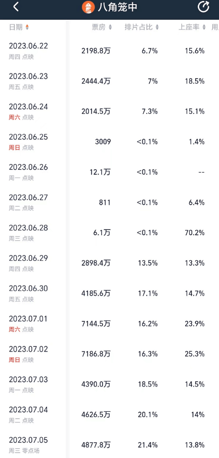 《八角笼中》从6月22日端午节就开始了点映,端午档三天排片各为6.7%、7%、7.3%,日票房都在2000万以上。从6月29日开始,又继续点映一周,直到上映。点映期间,其排片从13.5%增长到21.4%,日票房从2900万增长到4900万,累计点映票房达到了4.2亿元。