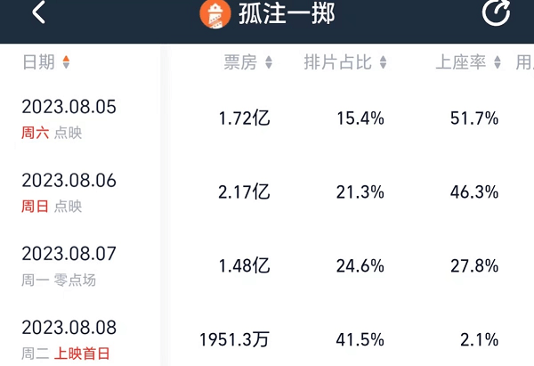 《孤注一掷》在离正式公映前一周的8月5日(周六)开启点映,当日拿到了15.4%的排片,收票房1.72亿元,仅次于2018年情人节点映的《西游记女儿国》(1.79亿),为影史第二高的点映票房。