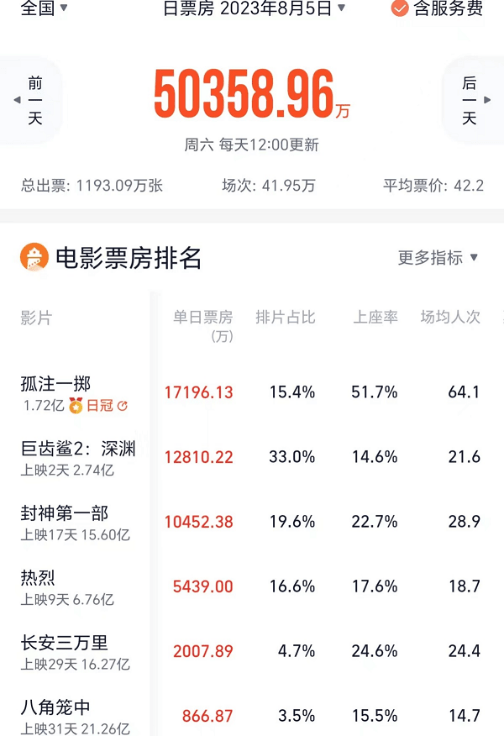 第二天,《孤注一掷》排片占比升到了21.3%,日票房近2.2亿元,上座率46.3%,场均人次60.9,依然遥遥领先。对比来看,《封神》《热烈》《巨齿鲨2》当日的上座率分别是21.9%、18%、16.1%,完全不在一个梯队。