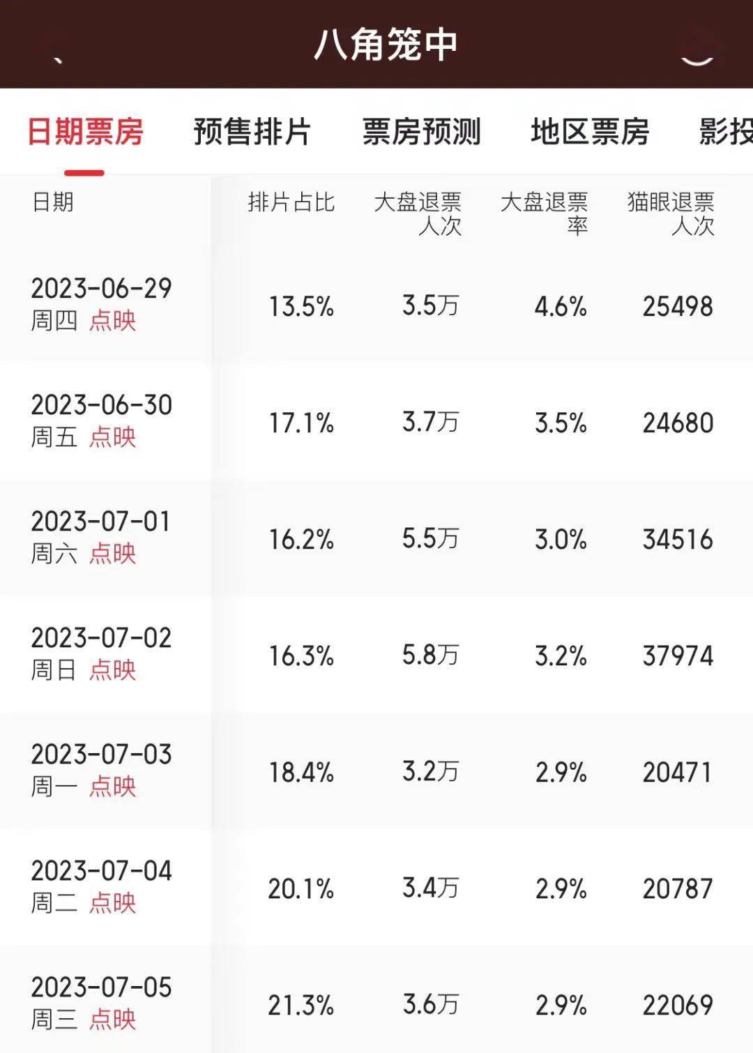 “超长点映待机”的《八角笼中》亦是如此,初期上座率和场均人次并不突出,市场表现平平,直到7月1日开始发力,周末观众数据得到良好反馈之后,7月3日开始,整体排片涨至20%左右。