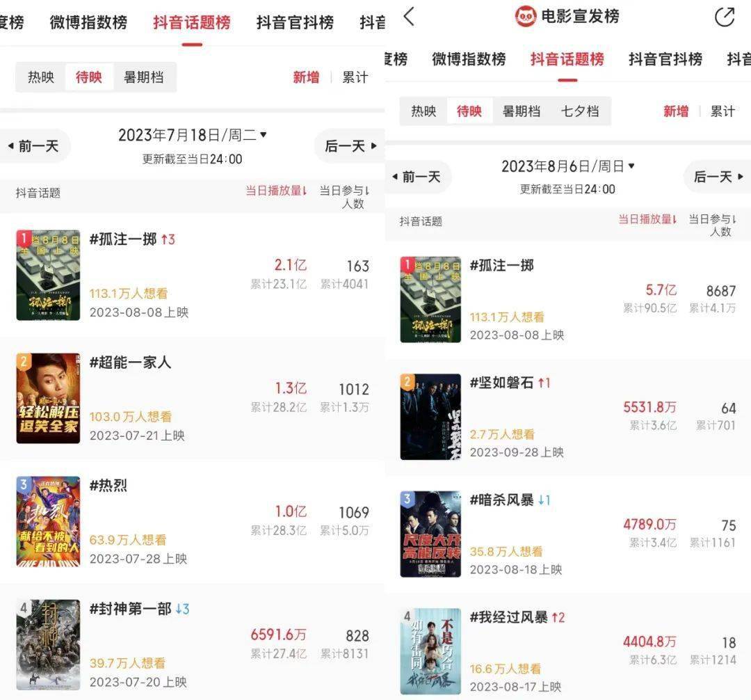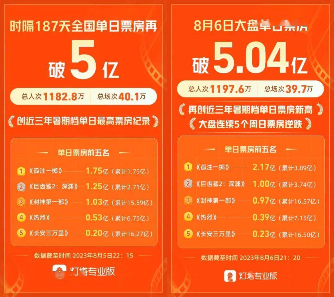《孤注一掷》的点映票房碾压上周末上映的所有新片,以及其他在映影片,与此同时,市场获得了空前的热度, 时隔187天后,连续两日拿下5亿的单日票房,创近三年暑期档单日最高票房纪录。