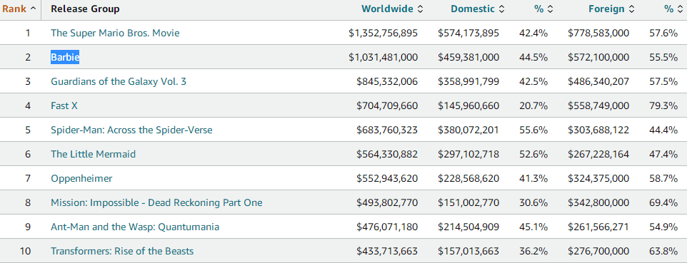 搜狐娱乐讯 (哈麦/文)《芭比》在全球卖爆了,该片上映17天,北美票房4.59亿美元,海外票房5.72亿美元,全球票房突破了10亿美元,暂居年度票房榜第二,最终可能超过《超级马力欧兄弟大电影》的13.53亿美元,夺下年度票房冠军。