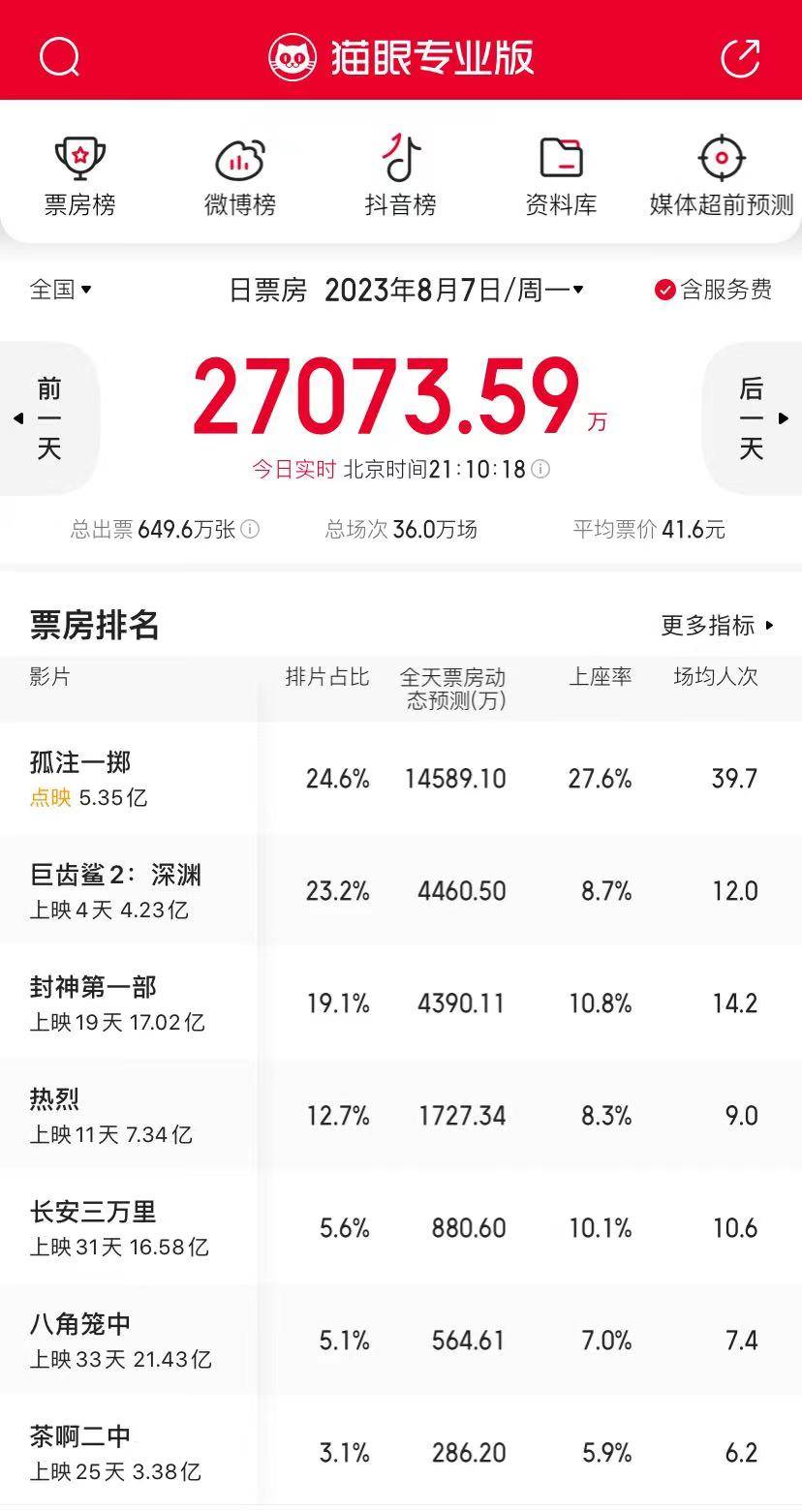 7日电影排片占比高达24.6%,上座率27.6%,票房1.5亿元,累计5.35亿元。
