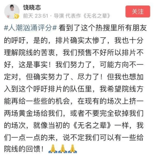 然而上映期间,导演饶晓志连夜发文,将责任推在排片量上。
