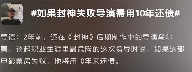 之后乌尔善又称这是他职业生涯里最危险的指导,如果《封神第一部》失败了,自己将用十年时间还债。