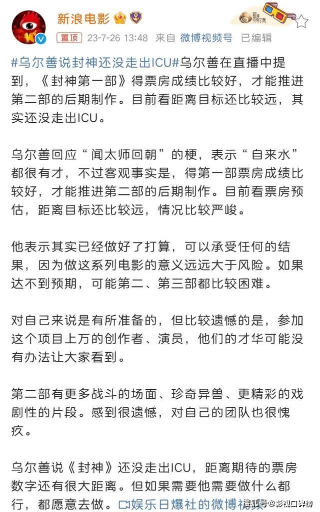 另外,导演的“卖惨营销”也有点过了。乌尔善导演为影片尽心尽力,令人尊敬。《封神三部曲》耗资将近30亿,导演称如果第一部票房收入不是很理想,不能回本,那么第二部、第三部很难和大家见面,目前看票房预估,距离目标还比较远,其实还没走出ICU。随后宣发把#乌尔善说封神还没走出ICU#刷上热搜榜。