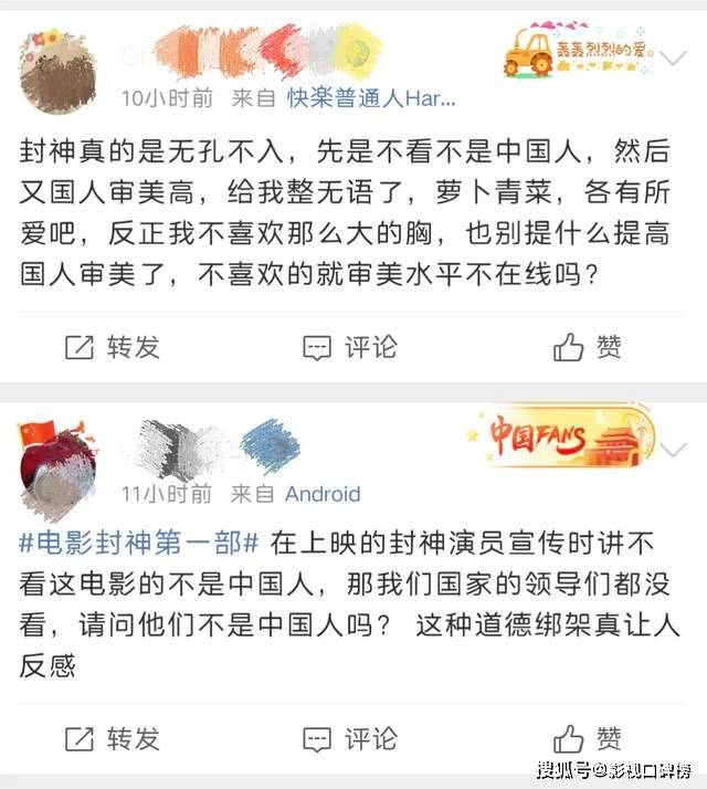 剧中主演于适在直播中说:不看封神,不是中国人。这一说法令人不适,有点道德绑架的嫌疑。