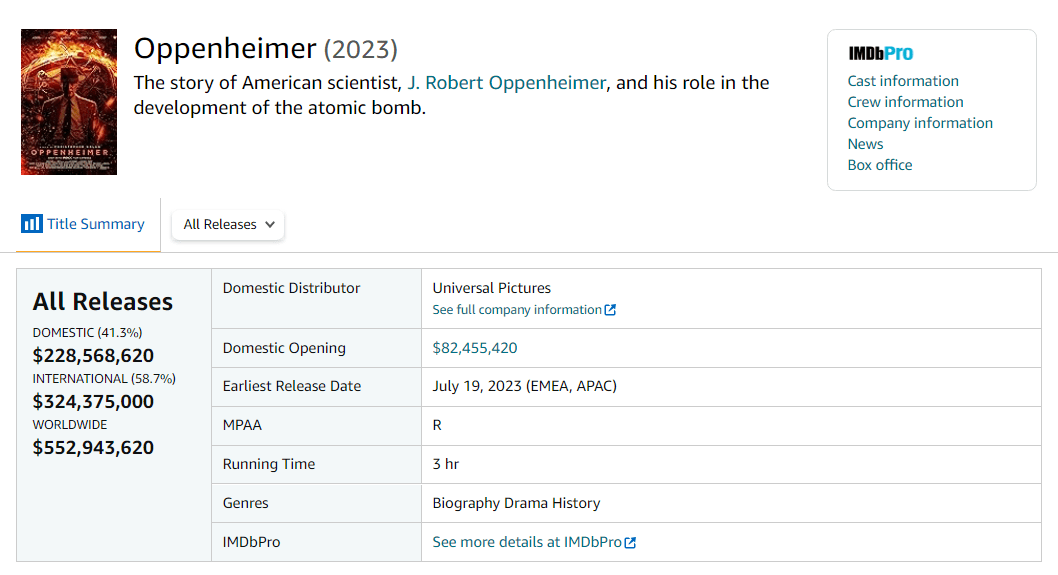 原标题:《奥本海默》北美上映17天票房超2亿美元 全球破5亿成影史票房最高二战题材片