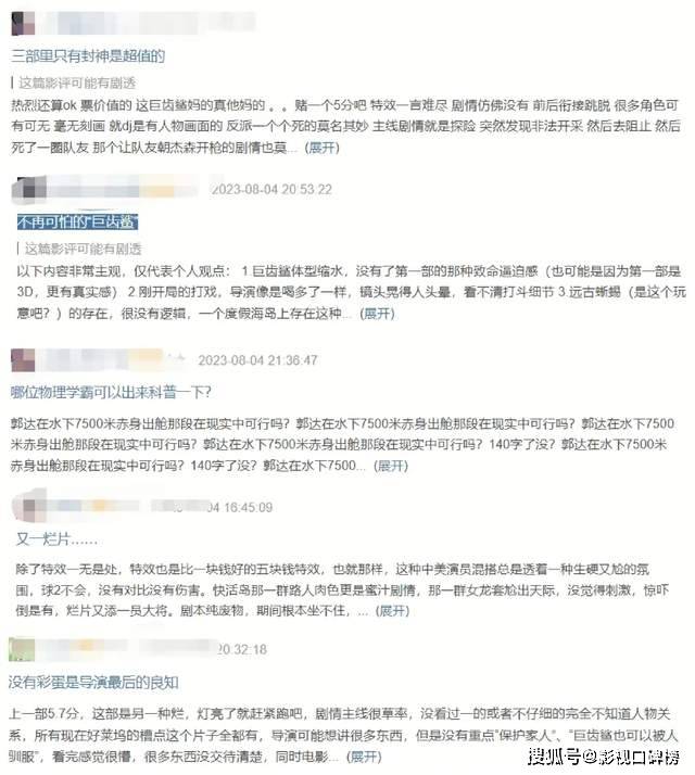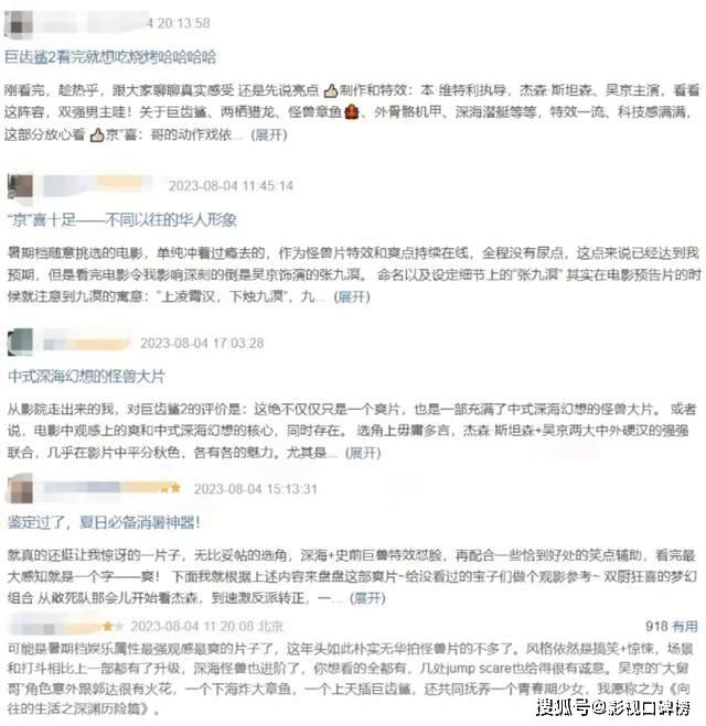 目前,有人评价《巨齿鲨2:深渊》精良特效 惊悚的氛围 偶尔搞笑的情节让人感到很爽,许多的细节都体现了对中国文化的用心宣传,而且两位主演的动作戏让人看得非常过瘾,是一部消暑大爽片。