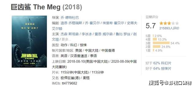 五年前,《巨齿鲨》在中国内地拿下10.53亿票房,全球票房达5.35亿美元,在全球掀起了一股“鲨鱼热”的潮流,但是它的豆瓣评分并不高,只有5.7分,甚至遭到了不少人的吐槽。今年《巨齿鲨2:深渊》既有我们熟悉的大鲨鱼 杰森·斯坦森,又有吴京加盟,让人期待。