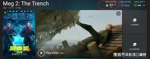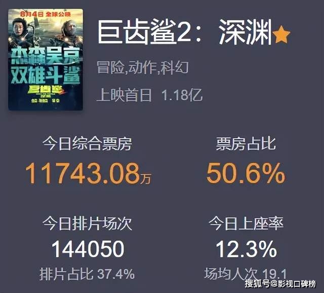 8月4日由杰森·斯坦森、吴京主演的中国主控首部深海怪兽大片《巨齿鲨2:深渊》全球同步上映。根据猫眼数据,截止8月4日21:00,该电影的该电影的综合票房约1.8亿,票房占比为50.6%,排片为37.4%。但是在国外的评分网站IMDB只给出了5.6分,烂番茄平台也只拿到了23%的新鲜度。