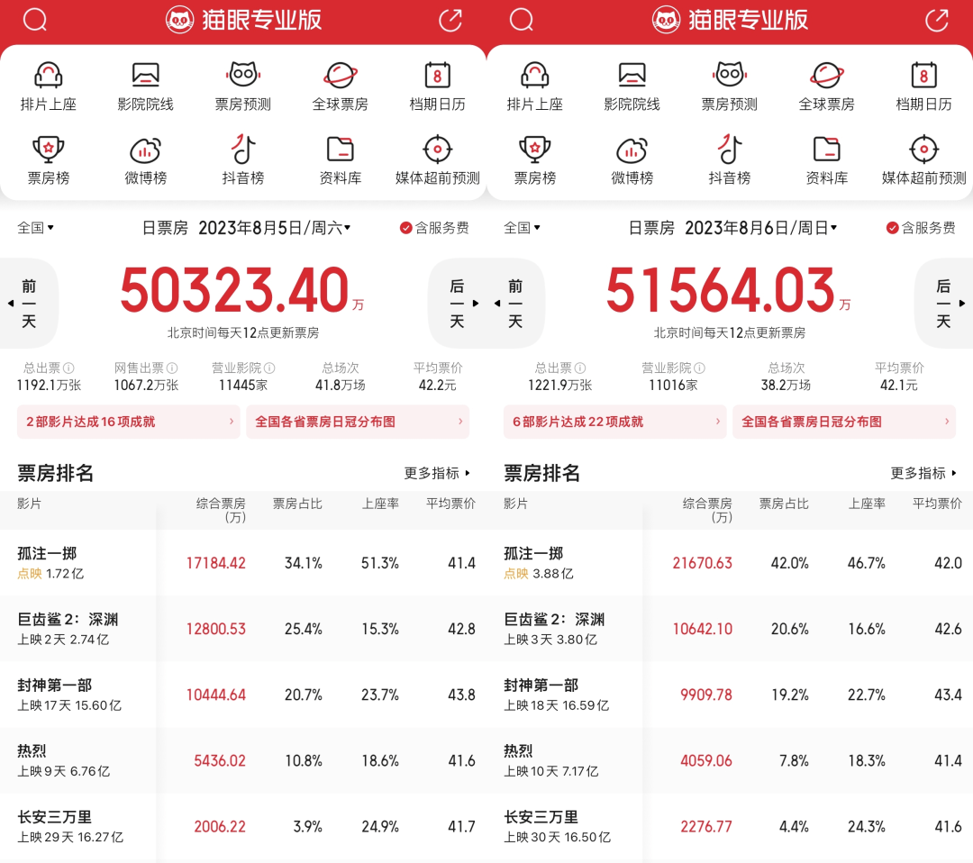 8月还有《学爸》《暗杀风暴》《绝地追击》《奥本海默》等中外影片上映。这些影片从题材类型、制作规模来比较,不会对《孤注一掷》《封神第一部》等票房头部影片造成直接威胁。因此,周末榜单中的电影四强仍有很大的票房增长空间。