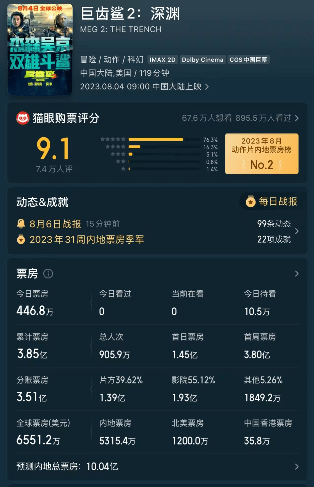 8月4日,《巨齿鲨2》公映首日报收票房1.45亿元,无悬念夺取单日冠军。猫眼专业版APP预测影片内地总票房为10.04亿元,略低于第一部10.53亿元的内地成绩。