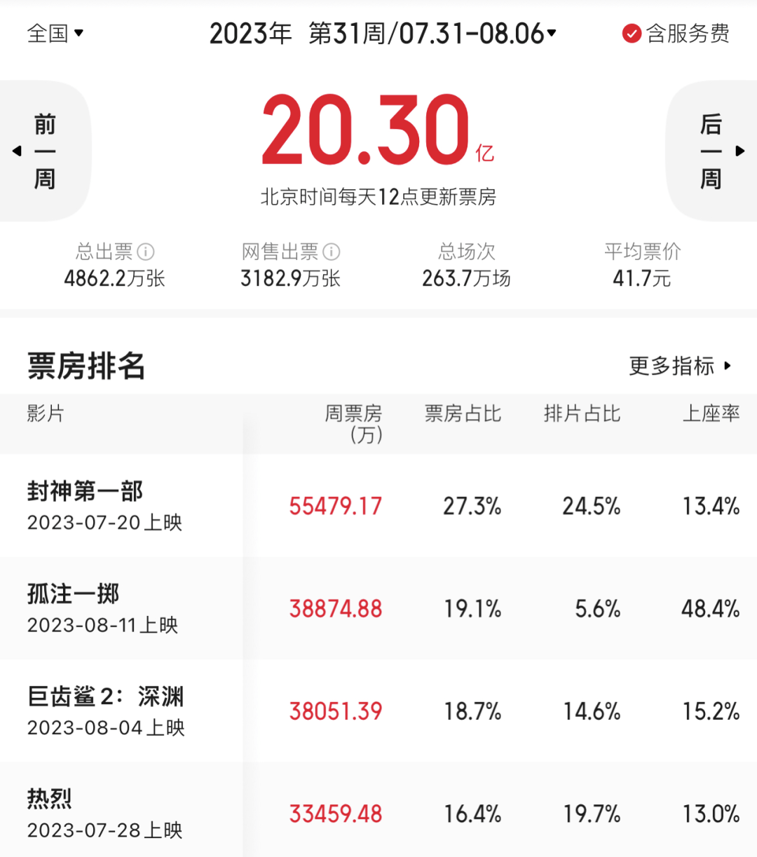 上周七天(7月31日~8月6日)电影市场累计收入票房20.3亿元,四强影片功不可没。它们是:《封神第一部》《孤注一掷》《巨齿鲨2》《热烈》。