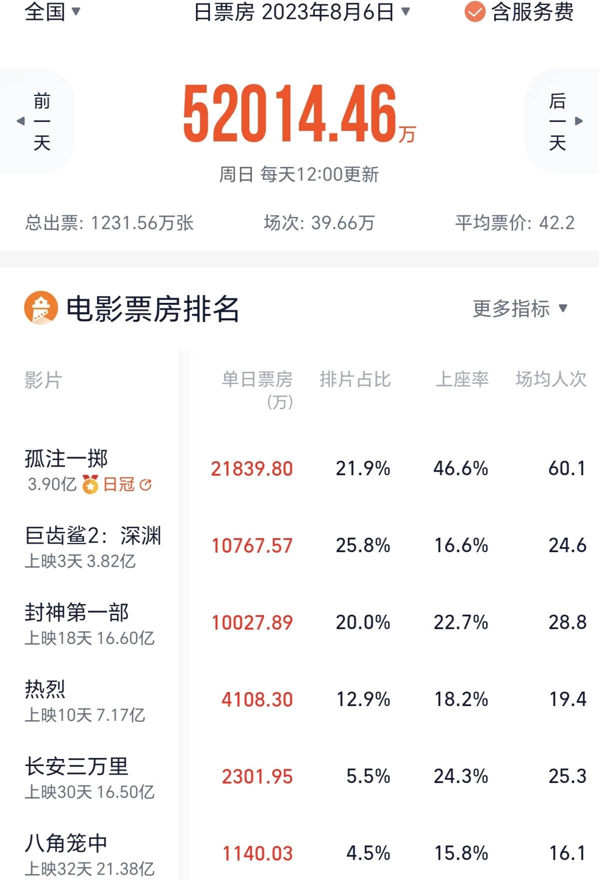 第二天,《孤注一掷》排片涨到了21.9%,收票房2.2亿元,上座率46.6%,场均人次60.1,仍然是断层领先。相比,《封神》《热烈》《巨齿鲨2》当天的上座率分别是22.7%、18.2%、16.6%,《巨齿鲨2》和《封神》票房都刚刚过亿,《热烈》收4100万元。