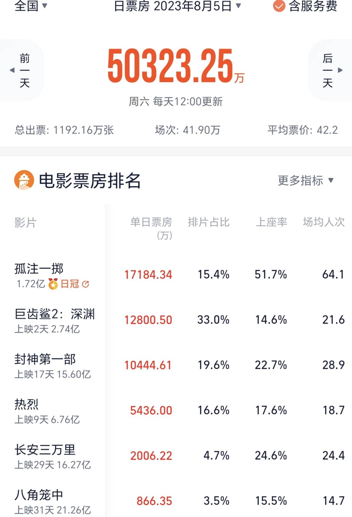 搜狐娱乐讯 (哈麦/文)暑期档迎来了爆款《孤注一掷》,该片点映首日以15.4%的排片拿下了1.72亿元票房,上座率高达51.7%,场均人次超64.1,远远甩开《巨齿鲨2》《封神第一部》《热烈》。