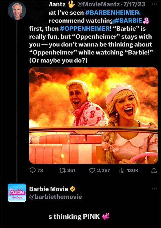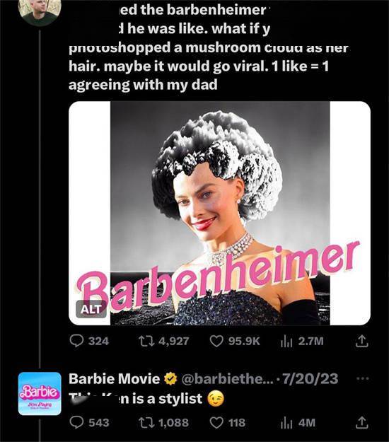 《芭比》电影官方社交平台账号在搞怪梗图下评论“这将是一个难忘的夏天”更是火上浇油,引来日本网民的集体炮轰,甚至发起了“No Barbenheimer”的话题来集体抵制电影。《芭比》的日本官方账号马上出来“灭火”,强调“芭比海默”的宣传标语并非官方发起,对于美国总部账号转发相关内容引起的讨论感到相当遗憾,并向所有被冒犯的影迷表达歉意。