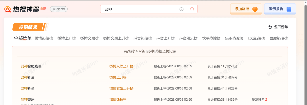 热搜神器Pro显示,《封神》全网热搜上榜1433条,今年票房冠军《满江红》和暑期档最大赢家《消失的她》,分别上榜热搜1193条、1263条。这意味着,《封神》已经不仅仅是一部电影,而是一种全民参与讨论的社会文娱现象。