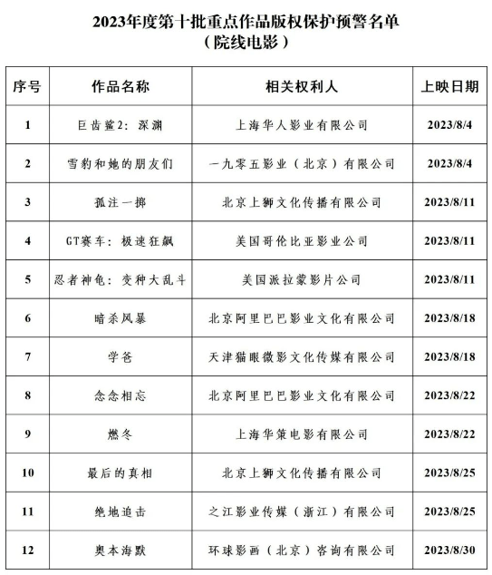 按照国家版权局《关于开展院线电影版权保护专项工作的通知》《关于进一步加强互联网传播作品版权监管工作的意见》及版权重点监管工作计划,根据相关权利人上报的作品授权情况,现公布2023年度第十批重点作品版权保护预警名单。其中,《巨齿鲨2:深渊》《雪豹和她的朋友们》《孤注一掷》《GT赛车:极速狂飙》《忍者神龟:变种大乱斗》《暗杀风暴》《学爸》等十余部影片均在名单中。