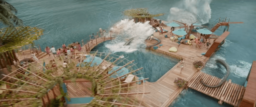 主角团逃生成功之后,海底的巨齿鲨和章鱼怪也不出意外地跑到了海面,反派团伙也没啥智商地继续对着主角团穷追不舍,危机又一次引向了游客聚集的海滩。系列第一部以及无数鲨鱼惊悚片都重现过的海岸屠杀,再次出现了。